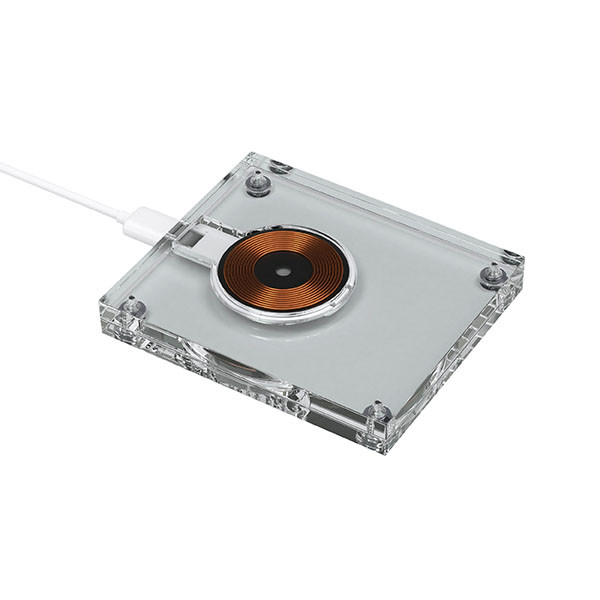 מטען אלחוטי שולחני אקרילי שקוף ומודרני המשלב טכנולוגיית טעינה מהירה עם מראה ייחודי ומרשים.